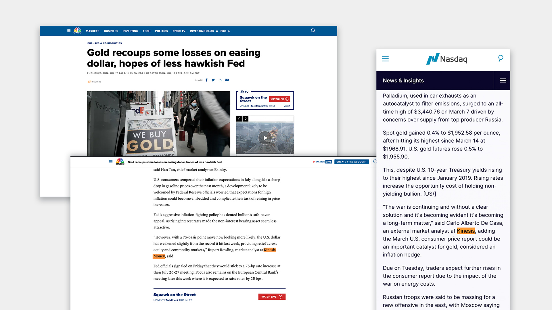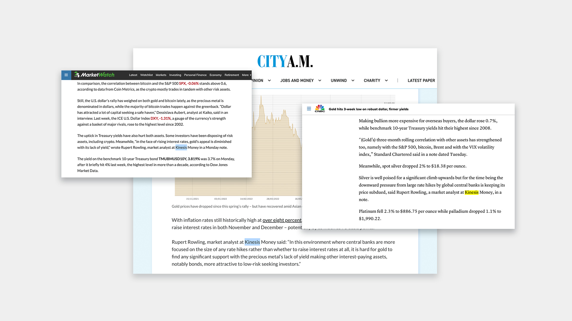- Strategic Communications: Gold is one of the most widely traded products with a history dating back centuries, therefore gaining traction in this highly competitive and heavily written about sector is difficult. For Kinesis Money to stand out, all the focus would need to be on what the company is doing differently to others and why it is a trusted voice. Drawing both from our team’s collective experience as metals journalists and work with other clients, we knew that regular commentary is a highly effective way to gain traction in the media.