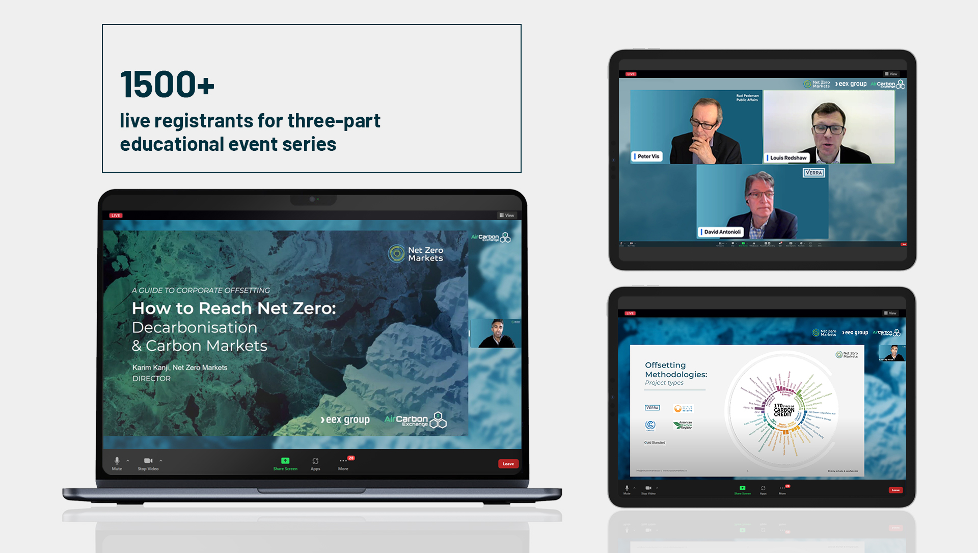 Results: The successful delivery of the ‘A Guide to Corporate Offsetting’ series, produced in collaboration with Net Zero Markets, AirCarbon Exchange and EEX Group drew in a global audience from across the environmental sector. The events featured key insights from industry figures such as David Antonioli CEO Verra, Claire Dorrian of London Stock Exchange Group, Mark Lewis of Andurand Capital Management, welcoming 1,500+ live registrants during the 3 part series.