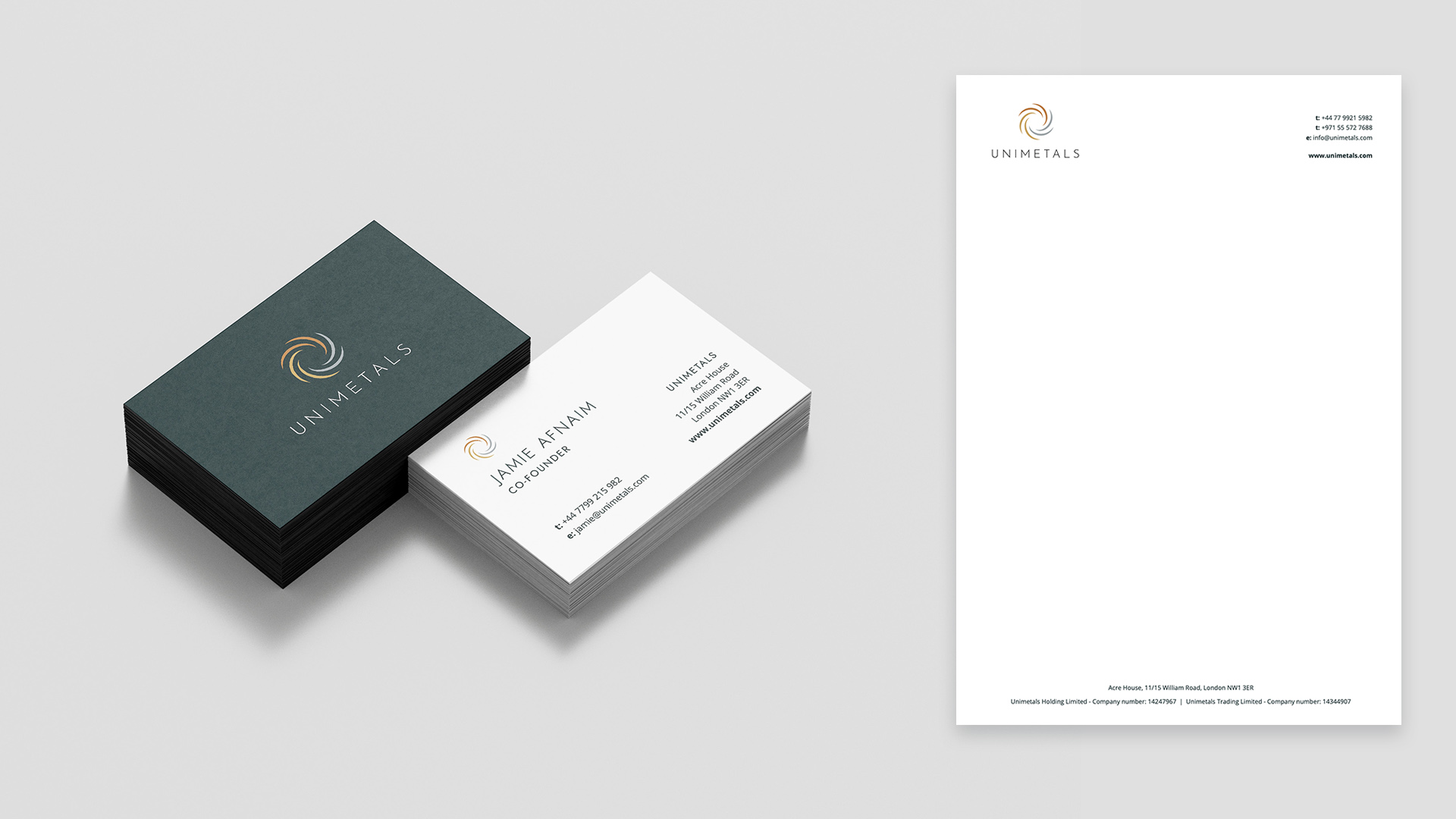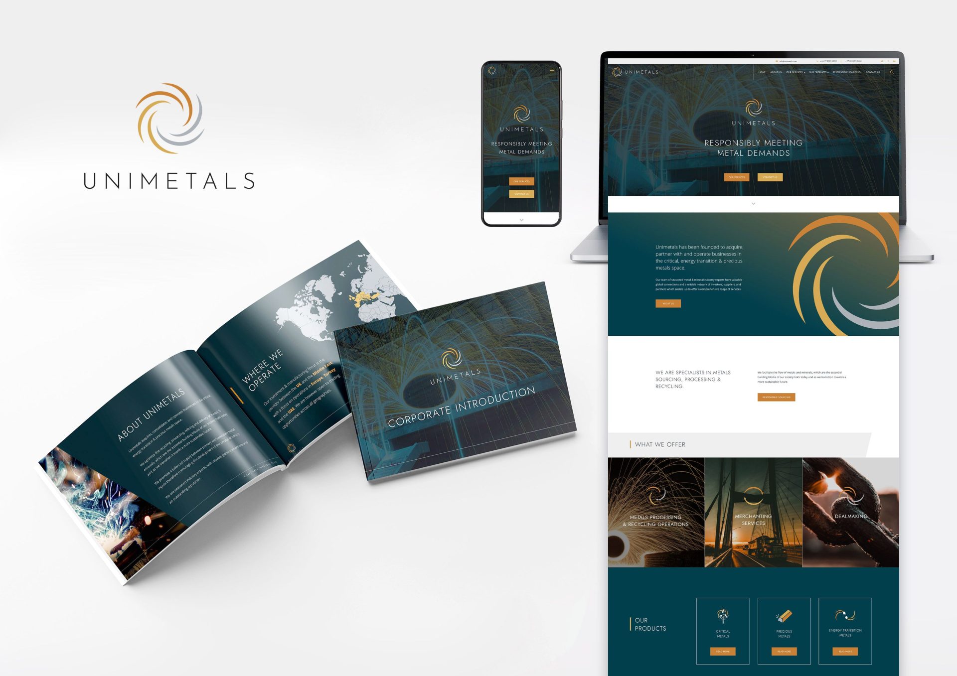 • Design & Branding: Design of the Unimetals brand brought together in-depth research and concept development to capture the meaning, values and story behind the ambitious recycling start-up. Emanating from a striking logo design, the repetition of circular elements – symbolizing cyclical life, flow, change, acquisition – were recurring motifs which extended across the final design system, from icons to selection of imagery, forming a striking design solution that resonated with the client.